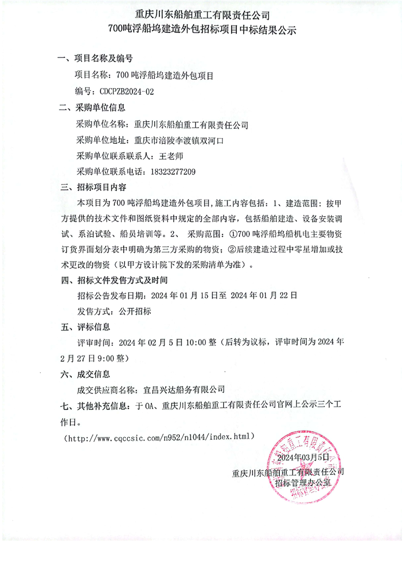 重慶川東船舶重工有限責(zé)任公司700噸浮船塢建造外包招標(biāo)項目中標(biāo)結(jié)果公示