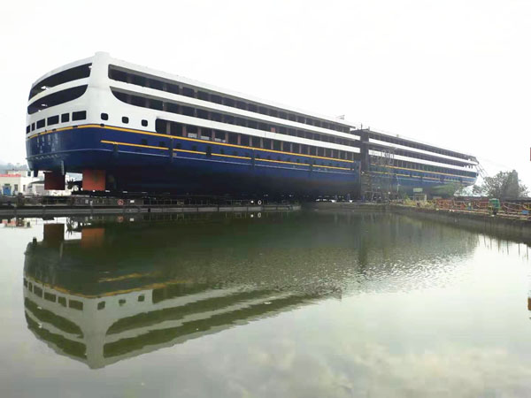 ????該船是公司有史以來建造體量最大的船舶,總長149.99米、型寬21.8米、型深4.5米、設(shè)計吃水2.9米,為鋼質(zhì)、雙尾、前傾首柱、雙槳、雙舵、雙電機(jī)驅(qū)動的郵輪,航區(qū)為 A、B、C級航區(qū)J2級航段,三峽庫區(qū),設(shè)計速度約24km/h。該船主要用于接待國內(nèi)外賓客游覽長江三峽,也可用于政務(wù)和商務(wù)接待,是長江干線重慶至上海移動的五星級水上酒店。