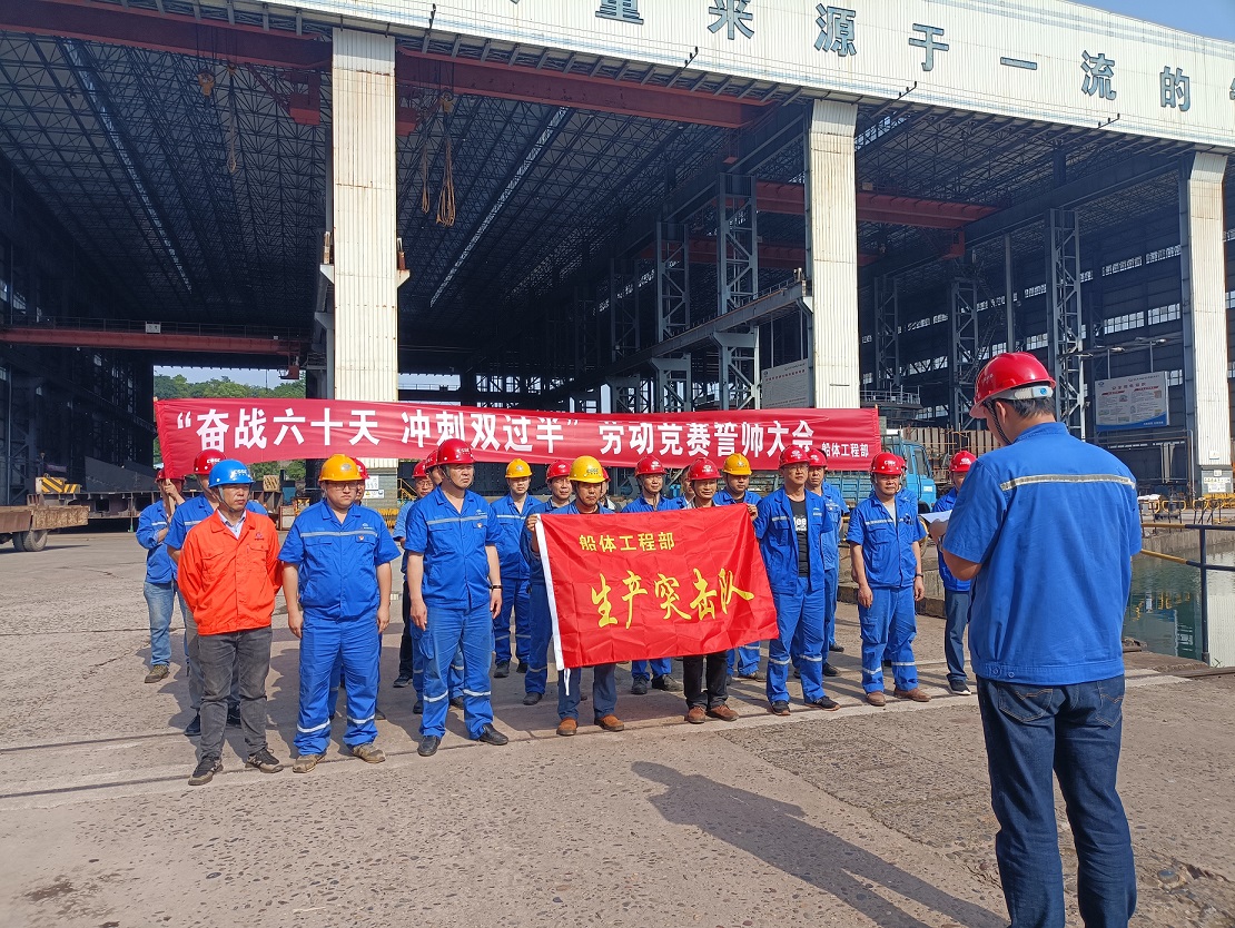 二是5月16日組織支部全體黨員與生產(chǎn)骨干、施工帶班組長成立生產(chǎn)突擊隊,舉行了“奮戰(zhàn)六十天,沖刺雙過半”勞動競賽誓師大會主題黨日活動。突擊隊隊長、船體部黨支部書記、部長余敏帶領(lǐng)大家作誓師發(fā)言,掀起了勞動競賽的熱潮。