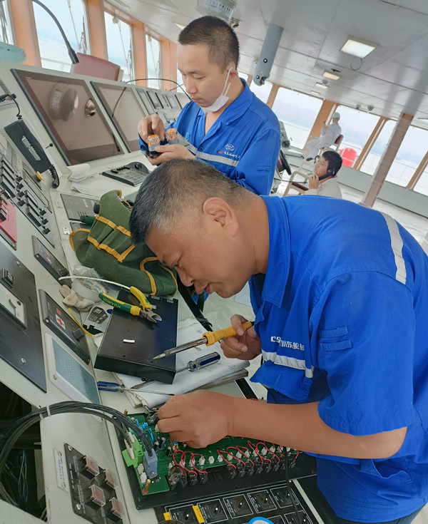5月31日中午,該船駛離南京東澤船廠碼頭后,隨即展開(kāi)了各項(xiàng)試驗(yàn)工作。駕駛室里,駕駛?cè)藛T熟練地操縱著羅盤和儀表,雷達(dá)和電子海圖即時(shí)顯現(xiàn)航道水深和船舶運(yùn)行情況;機(jī)艙內(nèi),機(jī)器轟鳴,試航隊(duì)員們聚精會(huì)神,時(shí)刻注意著主機(jī)和電力設(shè)備的運(yùn)行狀況;集控室中,工程技術(shù)人員全神貫注地注視著儀表和五彩的熒屏,采集、匯總各類技術(shù)數(shù)據(jù),呈現(xiàn)出一派緊張忙碌的試航作業(yè)景象。