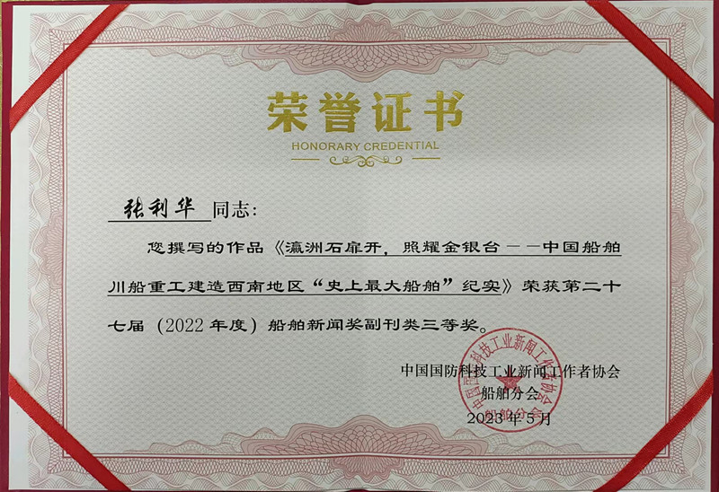 日前,由全國船舶記協(xié)組織評(píng)選的第二十七屆船舶新聞獎(jiǎng)、第十六屆船舶新聞先進(jìn)(優(yōu)秀)企業(yè)報(bào)刊評(píng)選結(jié)果揭曉。中國船舶集團(tuán)川東造船張利華撰寫的《瀛洲石扉開,照耀金銀臺(tái)——川船重工建造西南地區(qū)“史上最大船舶”紀(jì)實(shí)》榮獲船舶新聞副刊類三等獎(jiǎng);《川東船舶重工報(bào)》獲評(píng)(2022年度)全國船舶新聞獎(jiǎng)優(yōu)秀報(bào)刊,公司連續(xù)5年獲此殊榮。