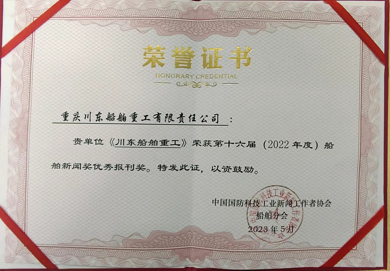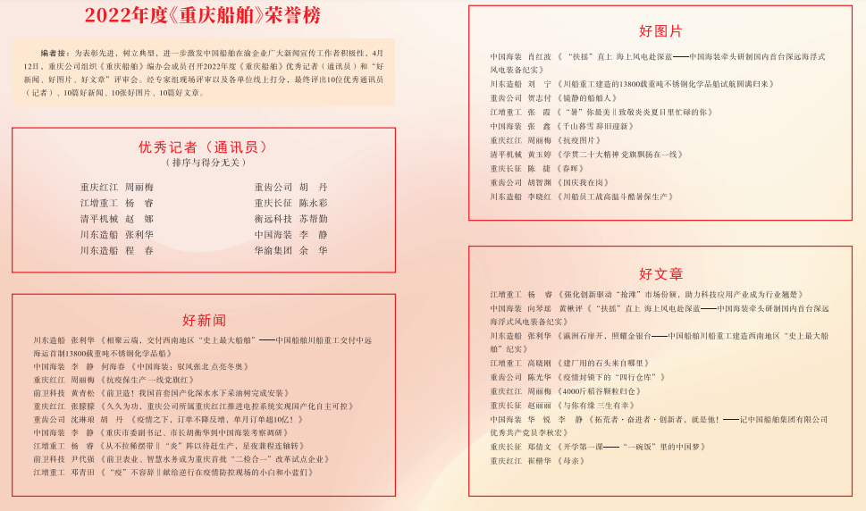 此外,在2022年度新聞宣傳工作中,公司2名宣傳工作者分別被評(píng)為中國船舶重慶公司宣傳思想工作優(yōu)秀記者、優(yōu)秀通訊員,1篇新聞、1篇文章、2張圖片分別獲評(píng)中國船舶重慶公司“好新聞”“好文章”“好圖片”。同時(shí),公司工會(huì)還榮獲重慶市國防郵電工會(huì)系統(tǒng)2022年宣傳信息報(bào)送工作二等獎(jiǎng)。
