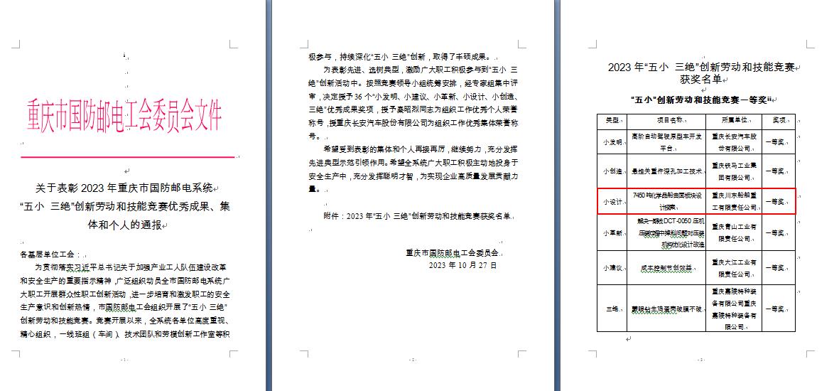 中國船舶川東造船一個技術項目獲重慶國防工會“三絕 五小”創(chuàng)新勞動和技能競賽一等獎