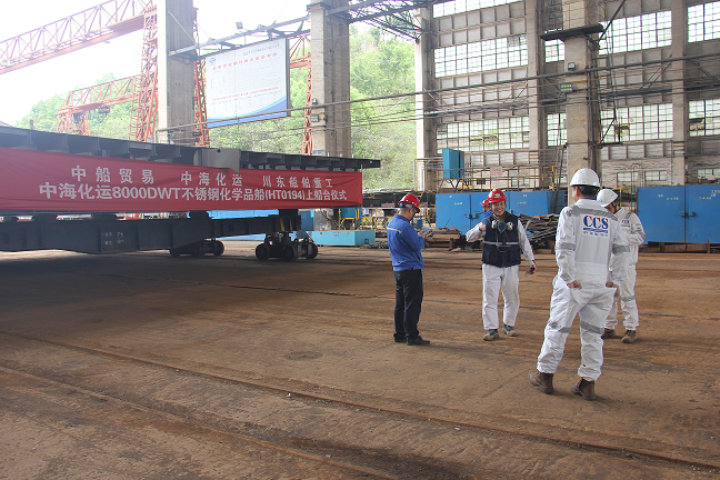 3月22日,由中國(guó)船舶集團(tuán)所屬重慶川東船舶重工有限責(zé)任公司為上海中海化運(yùn)承建的8000載重噸不銹鋼化學(xué)品船2號(hào)船(HT0194)實(shí)現(xiàn)上船臺(tái)生產(chǎn)節(jié)點(diǎn)。該船監(jiān)理、船檢及公司相關(guān)人員出席上船臺(tái)儀式。